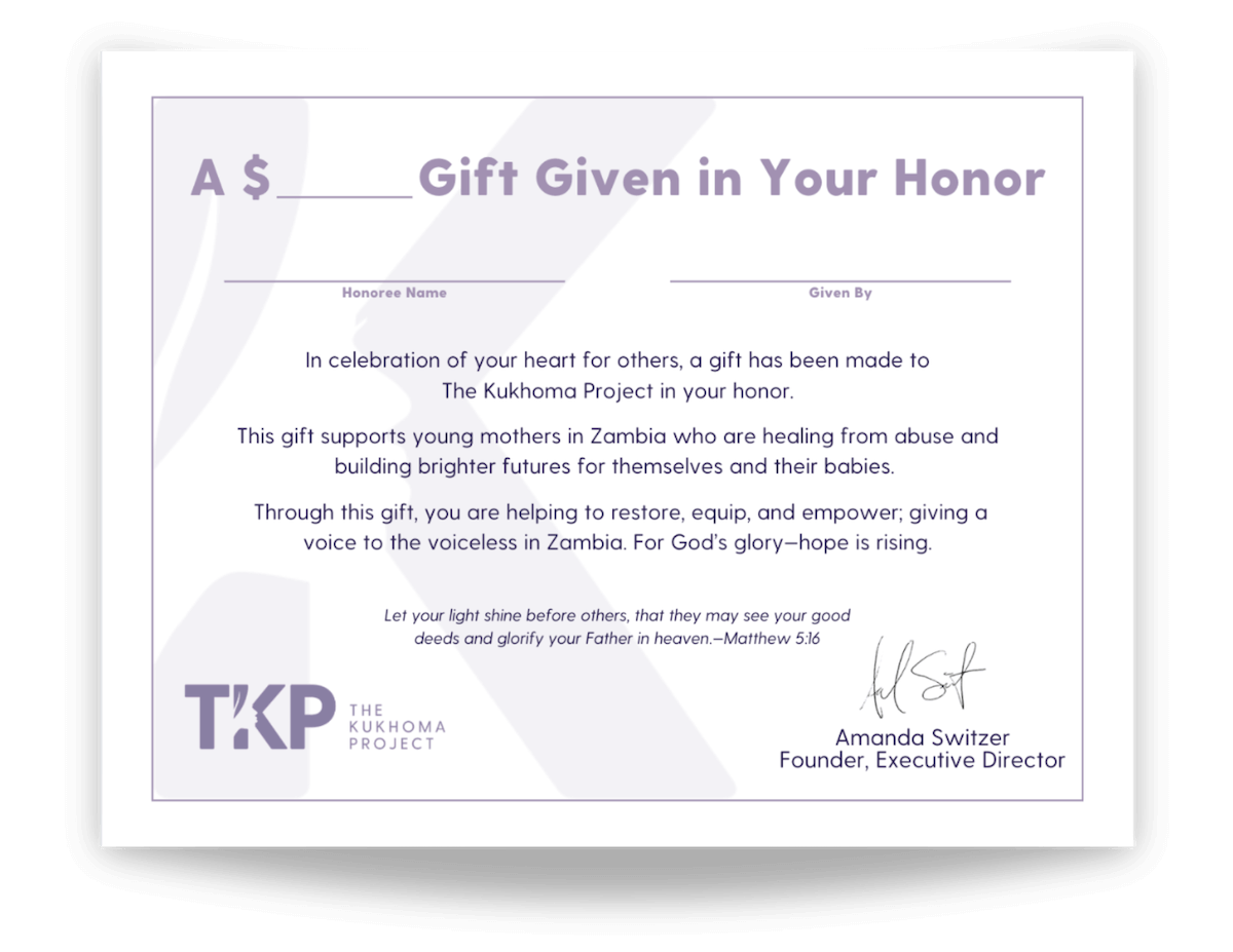 After you give, you’ll be able to download a simple certificate to share with your loved one—letting them know a gift was made in their honor that’s changing lives.