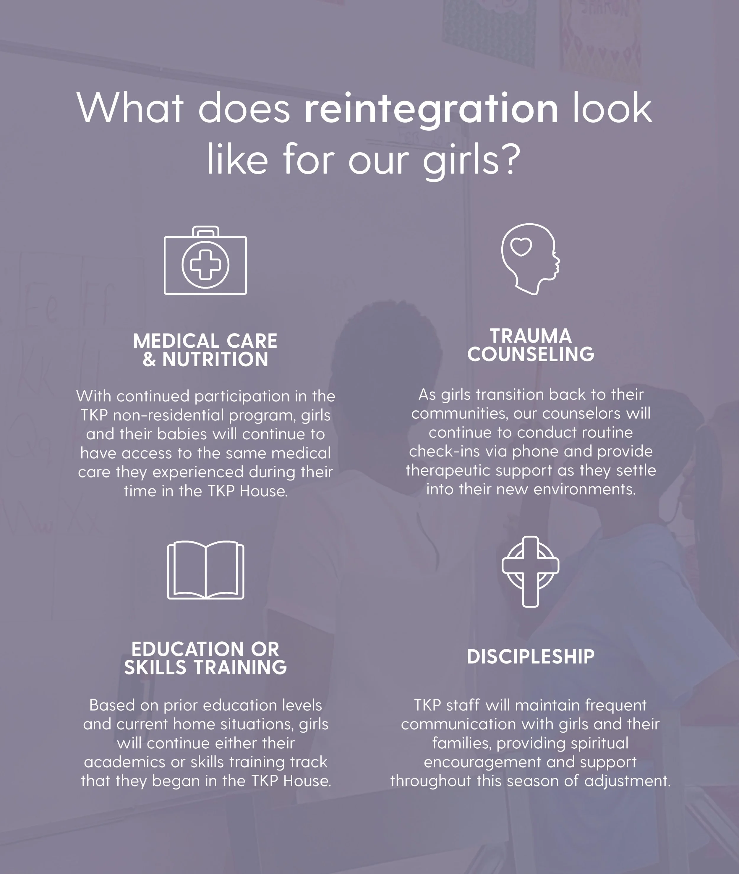 Our girls are preparing to reintegrate to the communities with their healthy and happy toddlers; and we couldn’t be more proud. Restored physically, emotionally, and spiritually, girls are ready to return to their homes, and we are excited to continue to support them in this transition.